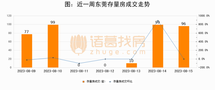 从存量房来看,2023年08月15日东莞存量房单日成交96套,比昨日减少3套,环比下降3%。从近一周存量房成交来看,东莞存量房日均成交套数为54套,08月15日单日成交96套,高于近一周平均水平77.8%。