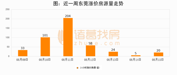 根据诸葛找房数据显示,东莞24小时涨价房源量为20套,较08月14日增加15套,环比上涨300%。与此同时,涨价房源占比小幅扩大,业主信心有所提升。