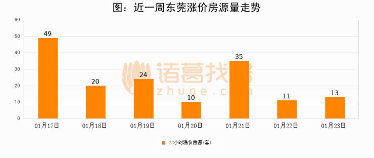 根据诸葛找房数据显示,东莞24小时涨价房源量为13套,较01月22日增加2套,环比上涨18.2%。与此同时,涨价房源占比小幅扩大,业主信心有所提升。