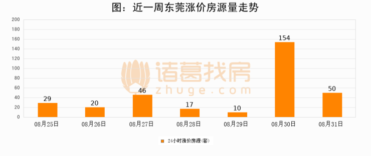 根据诸葛找房数据显示,东莞24小时涨价房源量为50套,较08月30日减少104套,环比下降67.5%。与此同时,涨价房源占比小幅回落,对于购房者来说是一个入市窗口期,购房者可抓住时机入市。