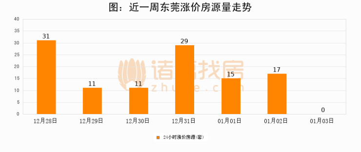 根据诸葛找房数据显示,东莞24小时涨价房源量为0套,较01月02日减少17套,环比下降100%。与此同时,涨价房源占比小幅回落,对于购房者来说是一个入市窗口期,购房者可抓住时机入市。