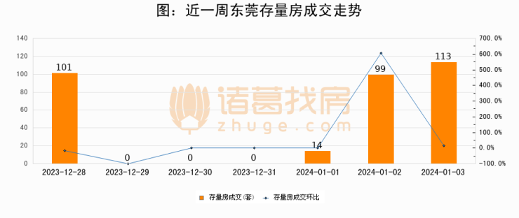 从存量房来看,2024年01月03日东莞存量房单日成交113套,比昨日增加14套,环比上涨14.1%。从近一周存量房成交来看,东莞存量房日均成交套数为46套,01月03日单日成交113套,高于近一周平均水平145.7%。