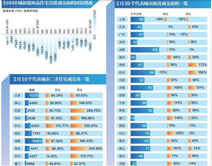 市场的回暖也反馈至数据层面。整体来看,2月份全国重点城市新房交易行情出现积极信号,在经历持续20个月交易数据的下降压力下,首次逆势崛起。来自易居研究院的统计显示,2月份,全国60个重点城市新建商品住宅成交面积2005万平方米,环比增长47%,同比增长37%。分城市来看,2月全国60个一、二、三四线城市,新建商品住宅成交面积分别为163万平方米、1020万平方米、822万平方米,环比增速分别为-18%、49%和70%,同比增速分别为-11%、40%和49%。