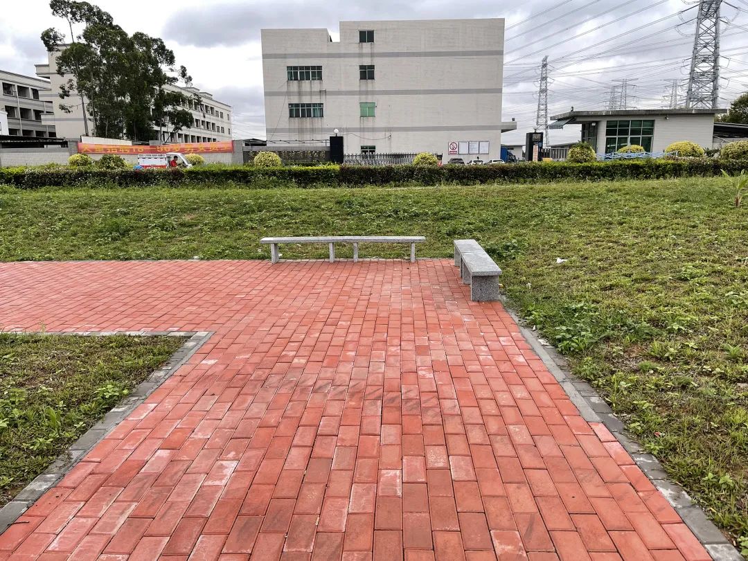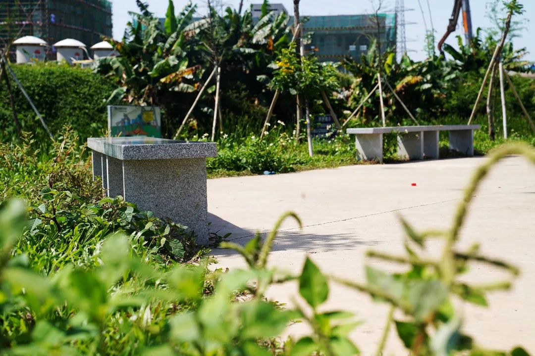漫步绿道途中,一间红砖房外立面绘制的自然风光墙绘图十分显眼,图中写着“建设美丽白濠、文明家园”等字样,为这条绿道增添了别样色彩。绿道两旁还贴心的砌有多张石凳,专门供市民放松休息。