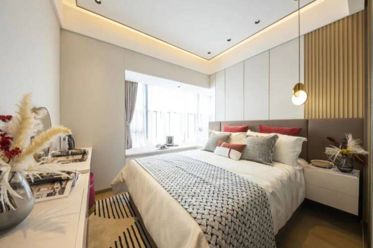 套间具有专业的空间美学设计,主卧最大的亮点是面宽将近 1.2 米的 270°转角飘窗,不仅能够享受更多的采光,而且也是主卧空间的延伸,使主卧的居住感受上更加宽敞明亮通透。