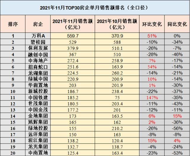 TOP30房企中,万科A、招商蛇口、中国铁建、滨江集团等房企11月销售额出现环比增长。其中,万科A环比增长51%、招商蛇口增54%、中国铁建增147%。