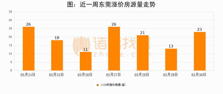 根据诸葛找房数据显示,东莞24小时涨价房源量为23套,较03月29日增加10套,环比上涨76.9%。与此同时,涨价房源占比小幅扩大,业主信心有所提升。