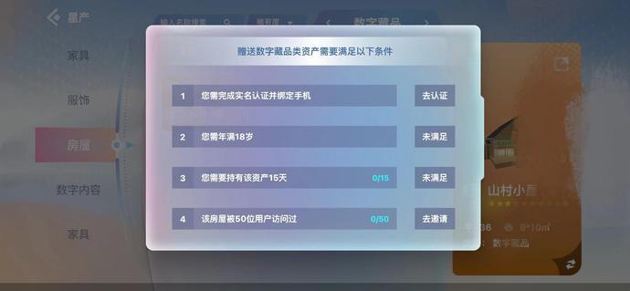 玩家在评估、交易虚拟房产时也是按照稀缺度高低,交易的实现,则是通过用户间的赠送功能。根据虹宇宙的规定,赠送方需要年满18岁、完成实名认证并绑定手机、持有该资产15天、该房屋被50位用户访问过。