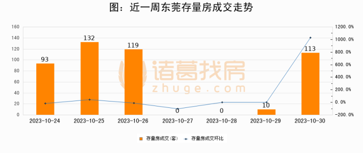 从存量房来看,2023年10月30日东莞存量房单日成交113套,比昨日增加103套,环比上涨1030%。从近一周存量房成交来看,东莞存量房日均成交套数为66套,10月30日单日成交113套,高于近一周平均水平71.2%。