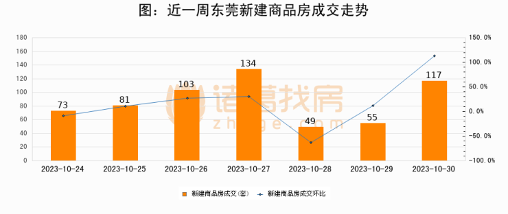 根据东莞市住房和城乡建设局数据显示,2023年10月30日东莞新建商品房成交117套,较昨日增加62套,环比上涨112.7%
