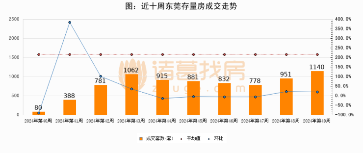 存量房方面,第49周东莞存量房成交1140套,较上周增加189套,环比上涨19.9%。从近十周成交走势来看,周均成交套数为780套,本周高于平均水平46.2%。