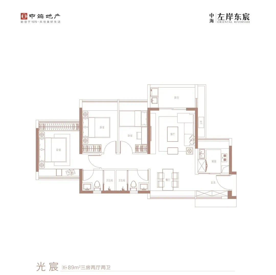 与城区一桥之隔的中海左岸东宸,推出的89㎡三房户型采用五开间布局,提高了三房户型的采光。