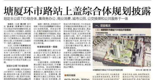·环市路TID(规划中):塘厦镇环市路站TID占地约8公顷,在塘厦中心区核心区范围内,将打造成一个汇集商务办公、商业消费、城市公园、公交换乘和公共服务于一体的上盖综合体。环市路TID地块有条件建设260米的高楼,成为区域第一高楼。