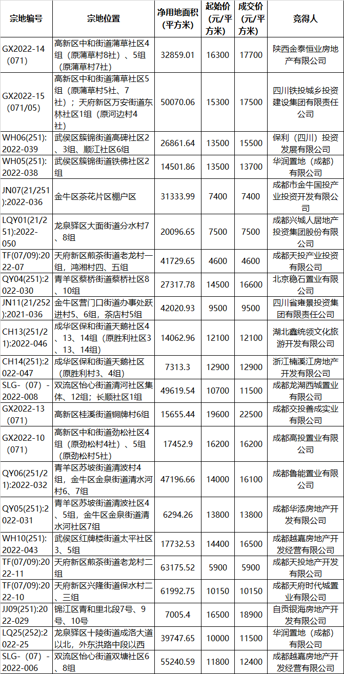 从拿地企业来看,国企竞得16宗地块占首日成交地块数量的72.73%。第三方机构中国指数研究院分析,民营企业参与度热度增加,知名房企包括龙湖集团(00960.HK)、旭辉控股集团(0884.HK)、石榴集团、新希望地产、金地集团(600383.HK)等;新面孔也不少,如成都华添房地产开发有限公司、四川鸿山实业集团有限公司、四川省雍景投资集团、金泰恒业房地产有限公司等。