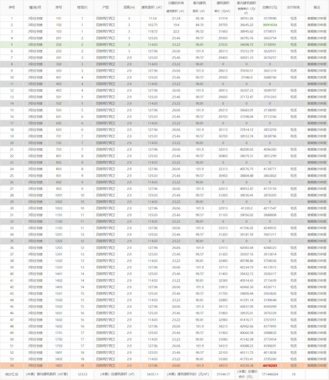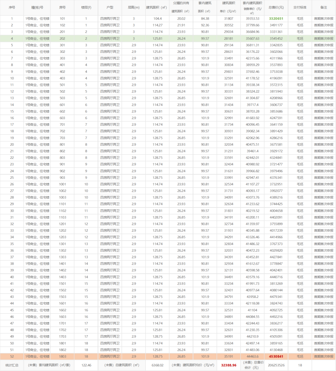 项目备案户型为建面约104-129㎡四房,产品毛坯交付。在此次通过备案的房源中,单价较低的是建面约114㎡的3号楼202号房,仅为27633元/㎡;单价较高的则是建面约128㎡的1号楼1803号房,单价约为34513元/㎡。(文末附首嘉·鹭湾1号备案价信息表)