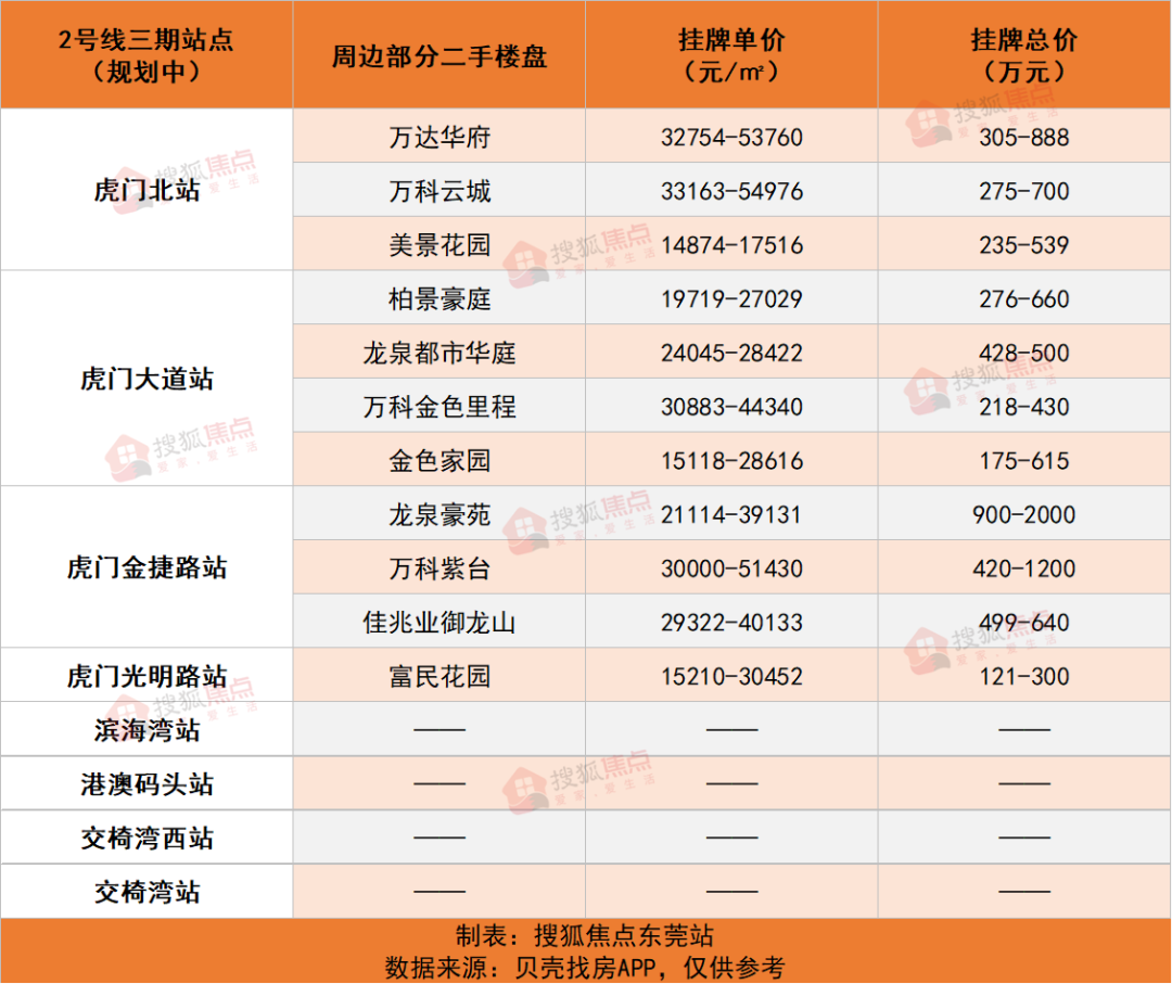 据搜狐君不完全统计,2号线三期沿线新盘较少,主要分布在虎门北站(滨海玺悦府、潜在供应:和府、和府二期)和虎门大道站(万科先进珑远未来之光、潜在供应:汉荣悦府、长城龙脉大厦)周边。
