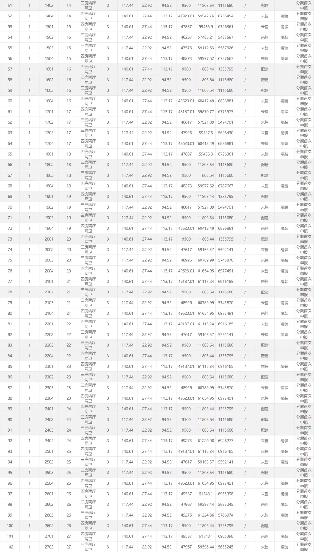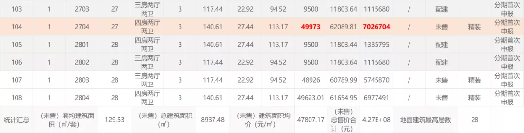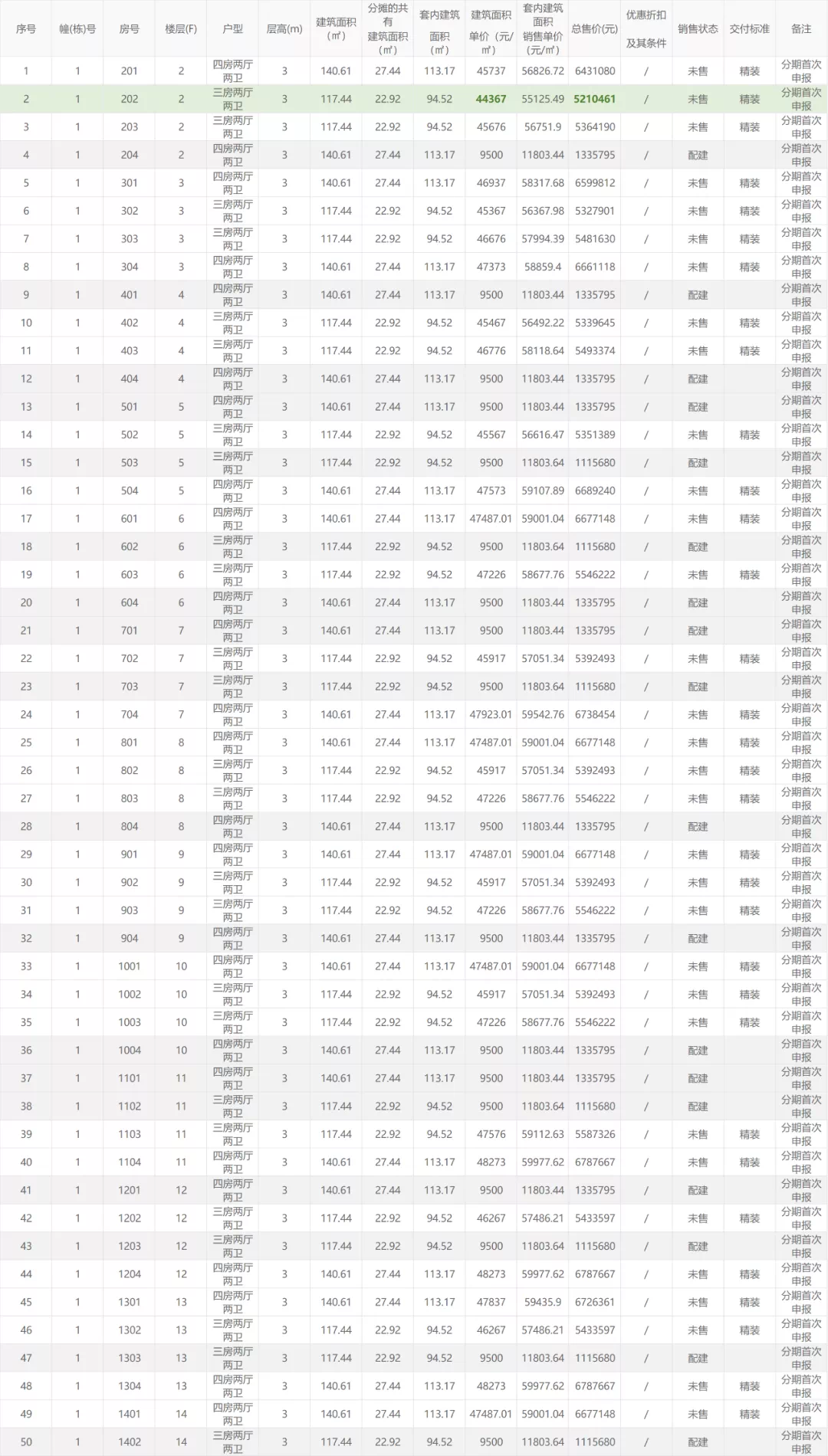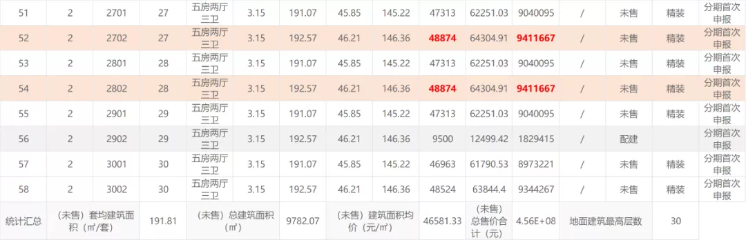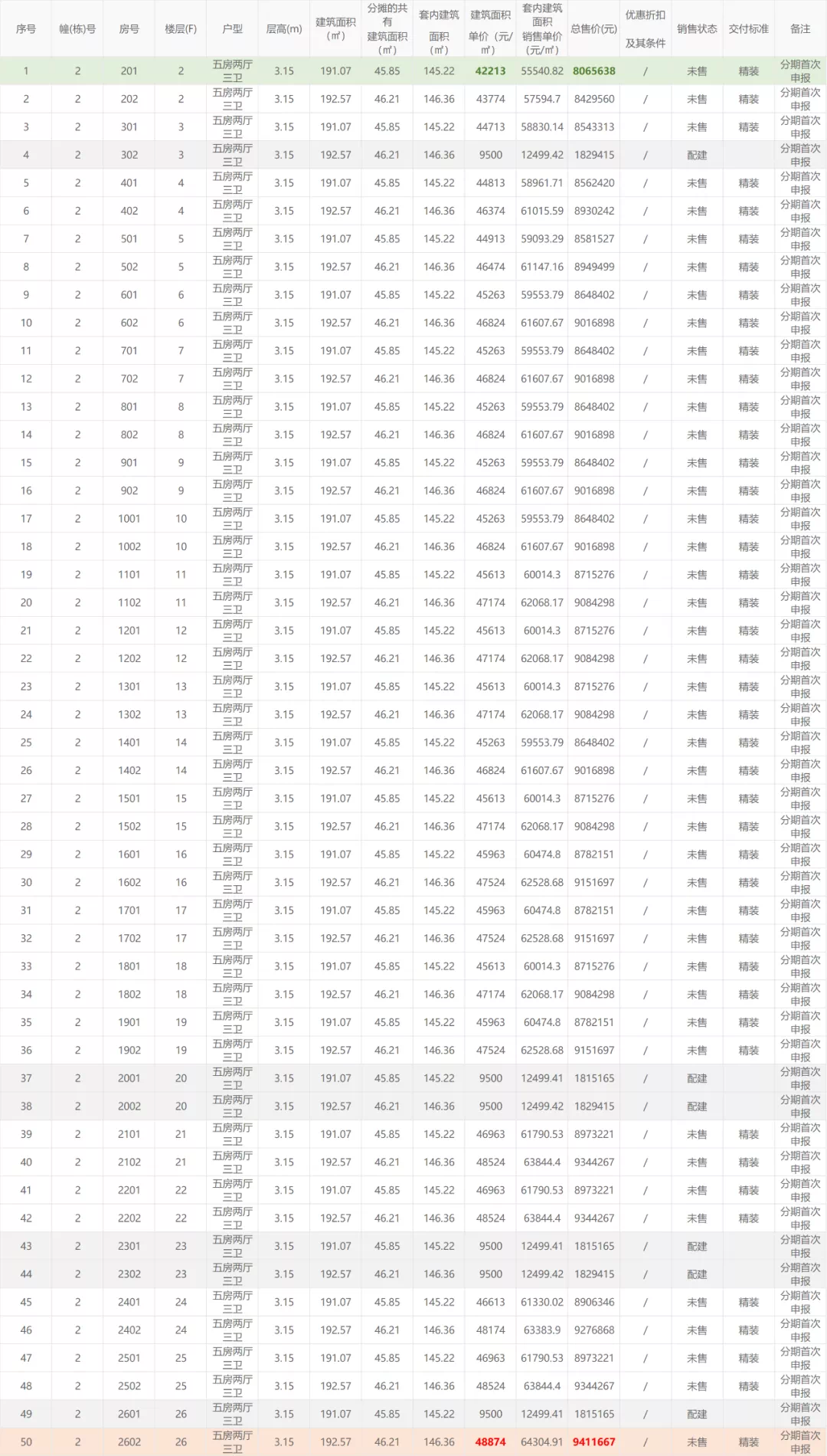 据了解,在此次通过备案的房源中,单价较低的是2号楼201房号191㎡五房两厅三卫户型,单价仅为42213元/㎡;单价较高的则是1号楼2704房号141㎡四房两厅两卫户型,单价为49973元/㎡。