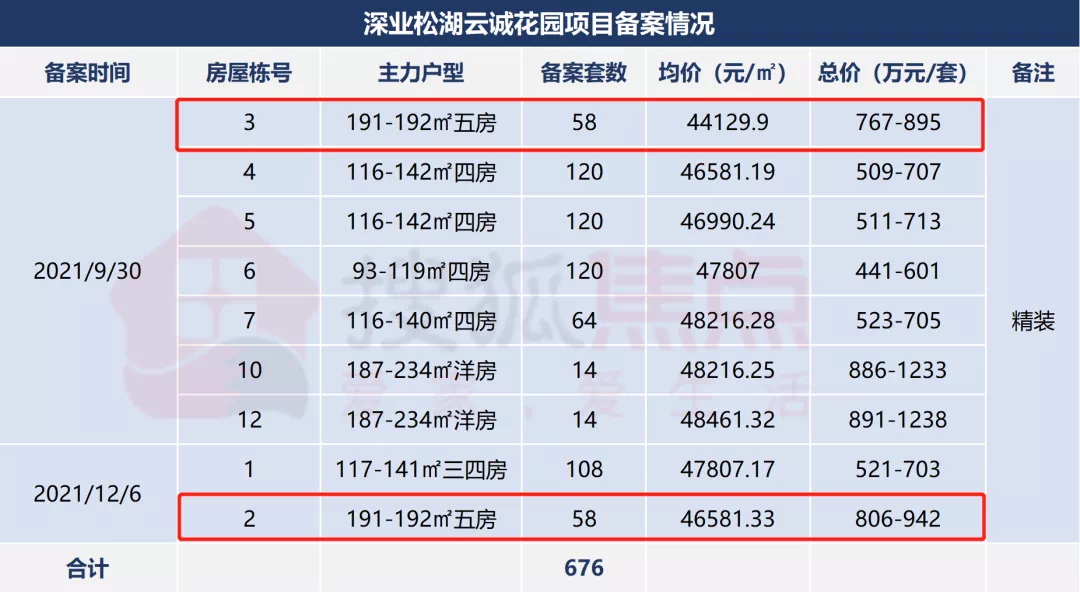 回顾深业·松湖云城项目首批房源备案情况,推出的是3、4、5、6、7、10、12号楼,合计510套房源(209套为人才配套住房),产品面积段约为95-230㎡,产品采用精装交付,备案均价44130元/㎡起,总价较便宜的一套三房约为442万元。