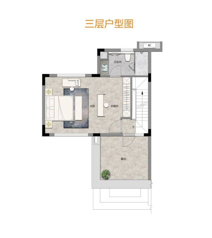 三层则作为主卧,属于配置豪华的套房,配置独立卫浴、衣帽间,独立露台。其中梳妆台、迷你吧与衣柜整体设计,更具空间开阔感。