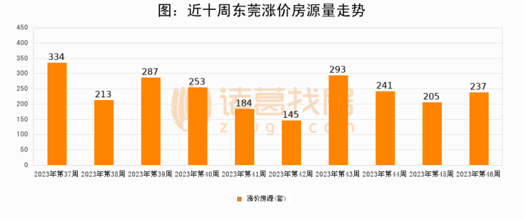 从调价房源来看,第46周东莞涨价房源237套,较上周上涨15.6%。与此同时,46周涨价房源占比提升1.88个百分点,业主信心持续恢复。