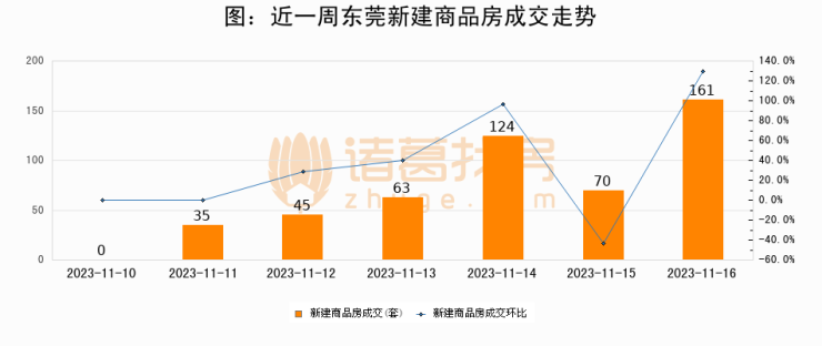 根据东莞市住房和城乡建设局数据显示,2023年11月16日东莞新建商品房成交161套,较昨日增加91套,环比上涨130%