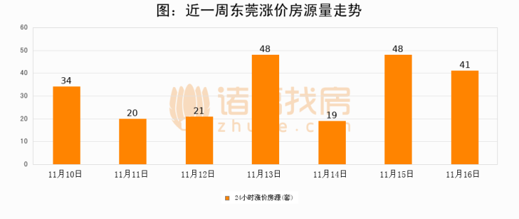 根据诸葛找房数据显示,东莞24小时涨价房源量为41套,较11月15日减少7套,环比下降14.6%。与此同时,涨价房源占比小幅回落,对于购房者来说是一个入市窗口期,购房者可抓住时机入市。