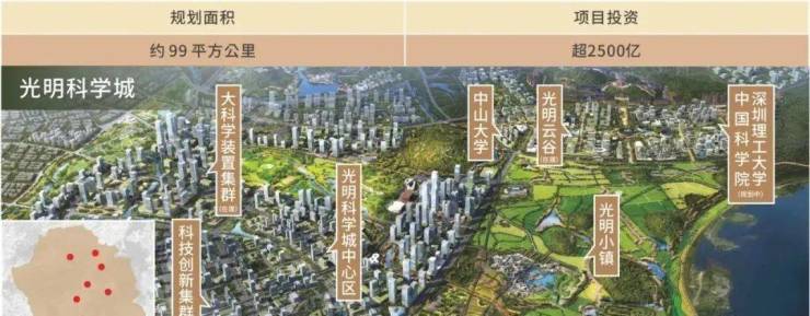 【光明科学城】规划约 99 平方公里,总投资超2500亿,包括10个科研机构平台、2所211研究型高校、9大科技基础设备,打造世界一流科学城。