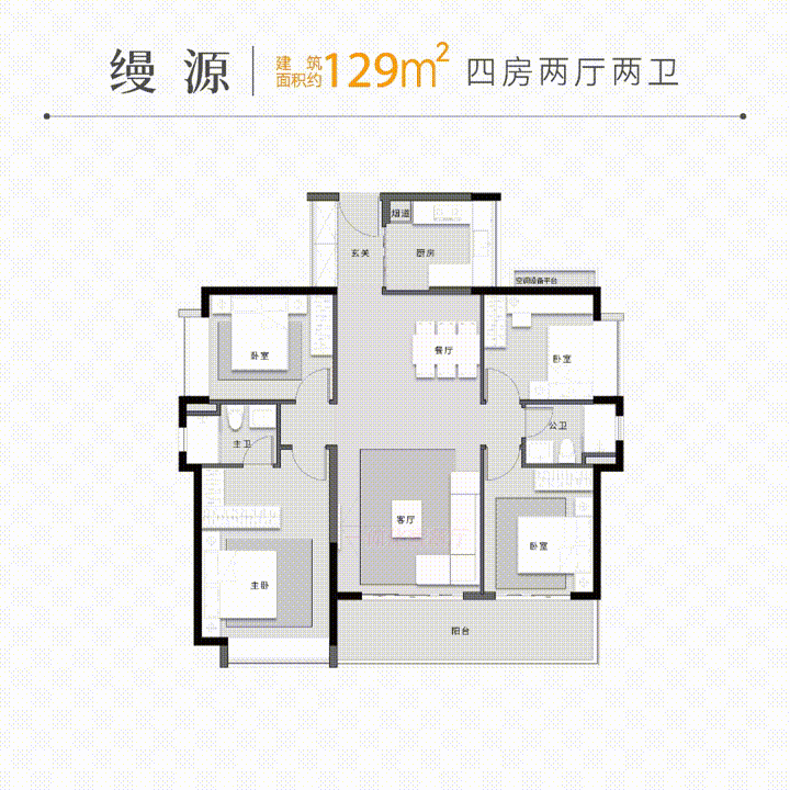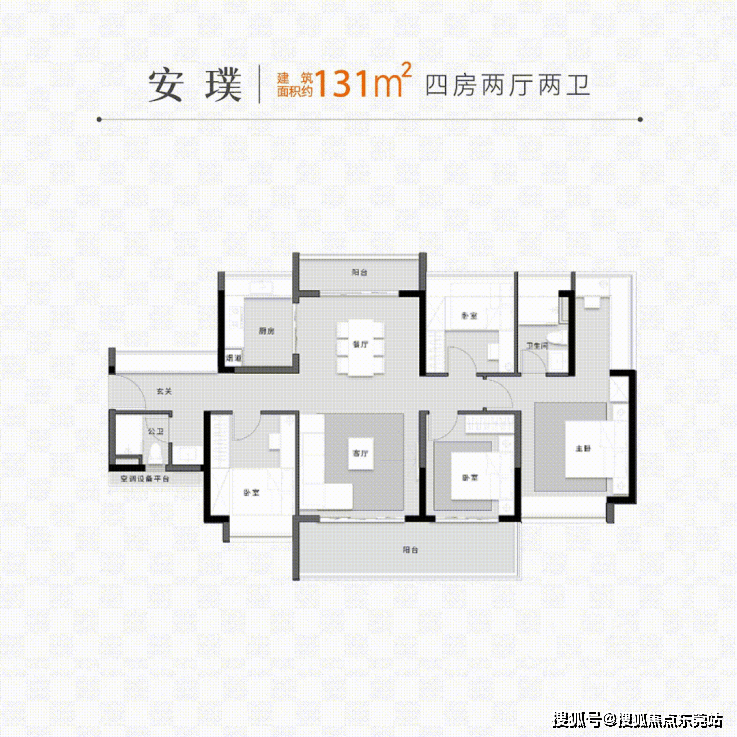 接着是建面约131㎡四房户型,多开间朝阳设计,采光更充足,大方厅+双联大阳台+超宽生活阳台;在格局打造上,每个空间都能发挥独特使用优势。玄关进门后即是卫生间,满足后疫情时代需求;靠近厨房、公卫和玄关的次卧可做独立老人房使用,互不打扰的同时,方便老人起居。