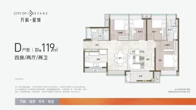 万科星城采用万科创新十字单体楼栋,户户朝南。建面约79-119m²三至四房,皆为万科经典王牌户型。适配单身、新婚、三口之家、三代同堂家庭,给一家人提供实用的居住空间。