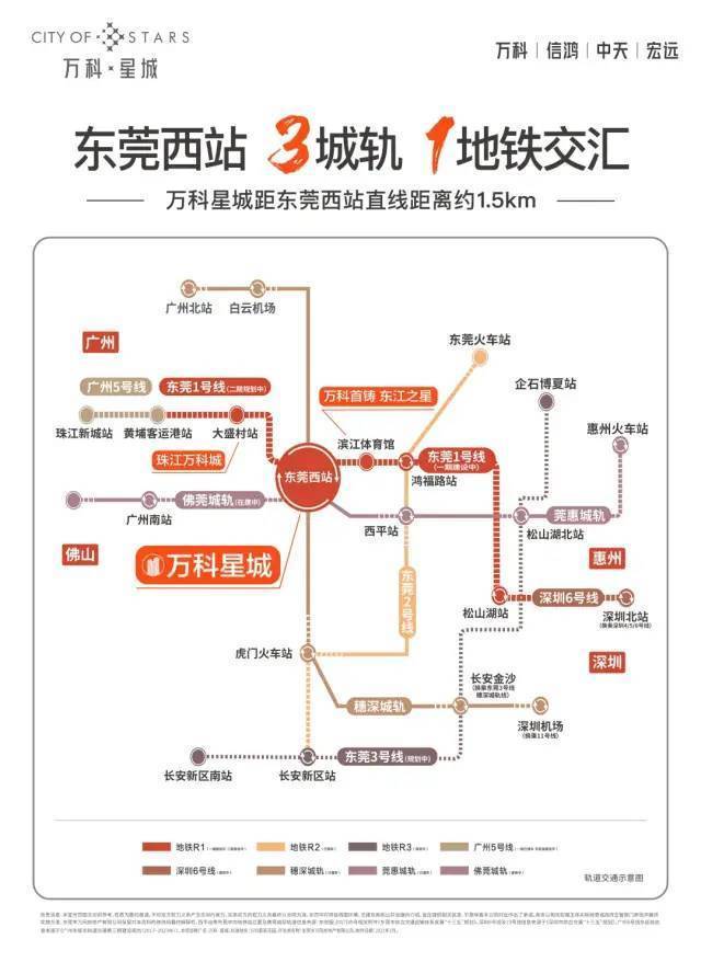 项目临近东莞西站,穗深城轨(已通车)、佛莞城轨(在建中)、莞惠城轨和R1线望洪站(在建中)均在东莞西站交汇,东莞地铁R1线一期工程止于东莞西站,据了解,东莞地铁R1线预计2024年通车。1 站 4 轨连 5 城,2 站西平,3 站广州,8 站深圳