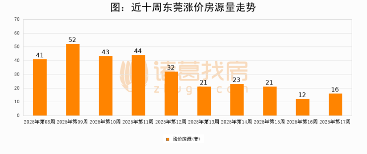 从调价房源来看,第17周东莞涨价房源16套,较上周上涨33.3%。与此同时,17周涨价房源占比提升2.44个百分点,业主信心持续恢复。