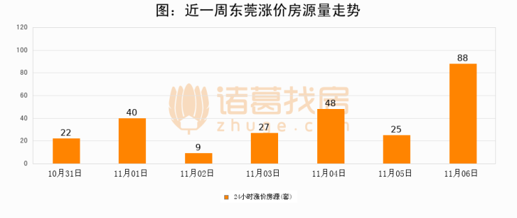 根据诸葛找房数据显示,东莞24小时涨价房源量为88套,较11月05日增加63套,环比上涨252%。与此同时,涨价房源占比小幅扩大,业主信心有所提升。