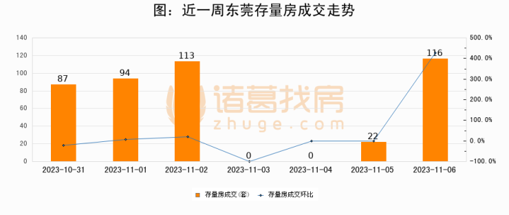 从存量房来看,2023年11月06日东莞存量房单日成交116套,比昨日增加94套,环比上涨427.3%。从近一周存量房成交来看,东莞存量房日均成交套数为61套,11月06日单日成交116套,高于近一周平均水平90.2%。