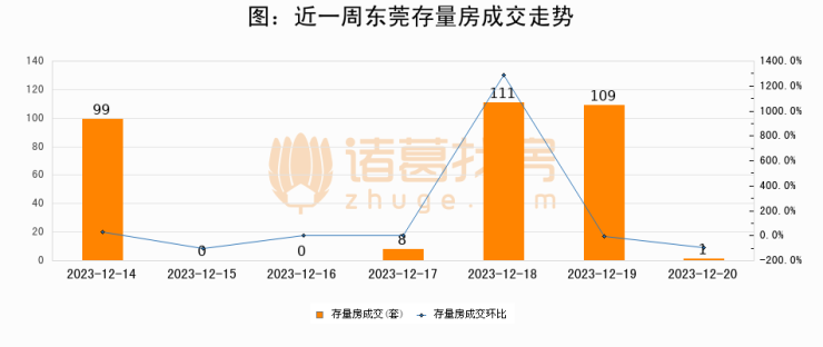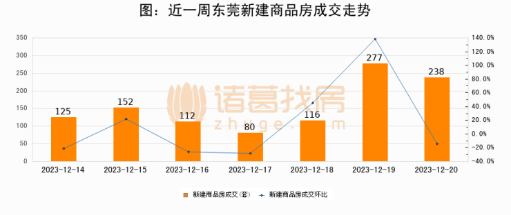 根据东莞市住房和城乡建设局数据显示,2023年12月20日东莞新建商品房成交238套,较昨日减少39套,环比下降14.1%