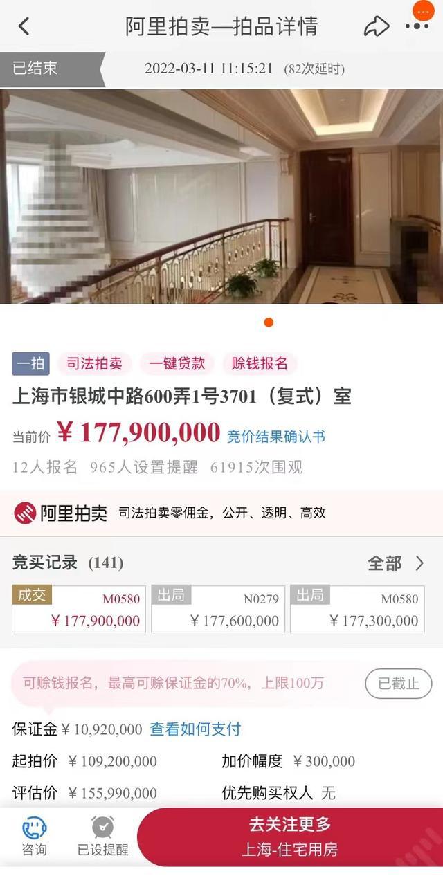 这次拍卖有964人设置提醒,12人报名,经过60247次围观、141次出价、82次延时,最终以1.779亿元成交,折合单价约30.01万元/平方米。
