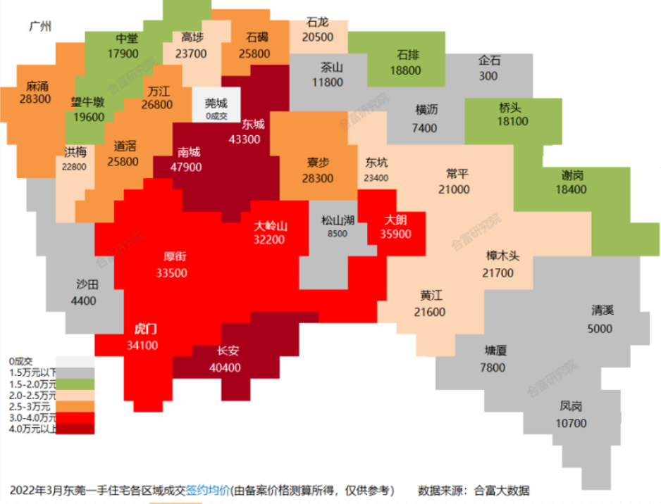 再来看下各镇区较新的房价情况:3月东莞共有7个镇区均价超过3万元/㎡,南城(47900元/㎡)、东城(43300元/㎡)、长安(40400元/㎡)等镇区新房网签均价较高。