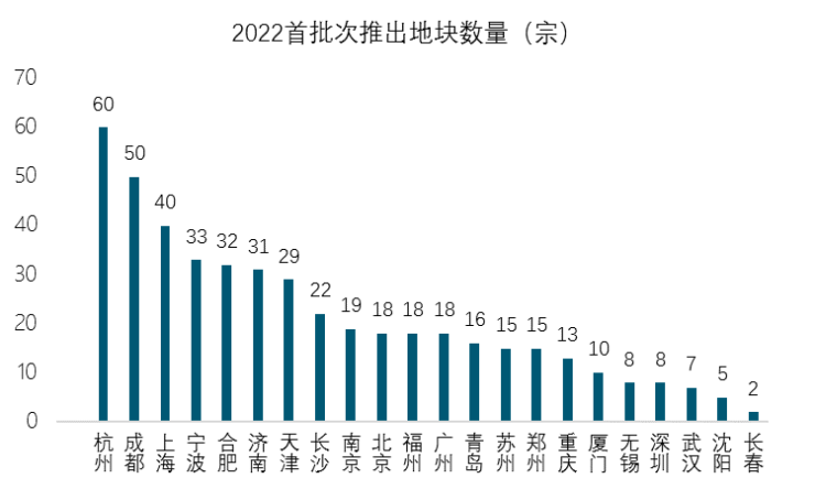 按照中指研究院数据,今年首批次集中供地期间,部分城市将全年推地时间调整为4批次,导致首批推出规模较去年降幅明显。22城首批共推出涉宅用地469宗,建设用地面积2135万平米,同比下降58.5%;推出规划建筑面积4713万平米,同比减少6707万平米,较去年集中供地推出减少58.7%。从2022年首批次推出的地块数量来看,推出宗数最多城市位于长三角区域城市杭州,60宗地块在首批次推地的城市中数量最多,其次成都推出50宗,上海推出40宗;东三省区域城市沈阳推出5宗,长春出让2宗涉宅用地,数量最少。