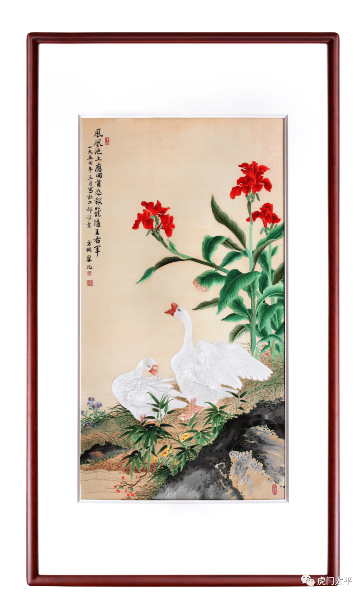 末代广绣“花佬”、广绣国家级非遗传承人许炽光的《咏鹅》,劈丝施绣,羽将羽丰绒厚的形态特征充分表达。