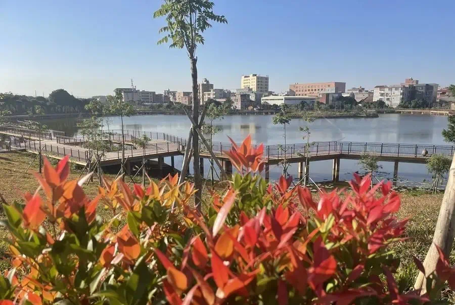 走进三江湖湿地公园,眼前是郁郁葱葱的树木,观赏类乔木、灌木繁多,主要有红花羊蹄甲、木棉、铁冬青、嘉宝果、杜鹃红山茶等,观花观果种类多样,形成独特的苗圃景观。