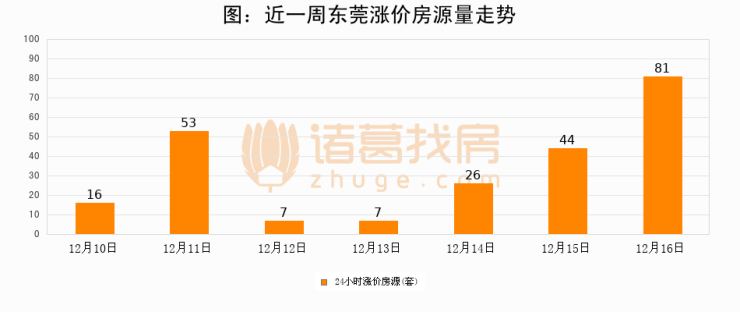 根据诸葛找房数据显示,东莞24小时涨价房源量为81套,较12月15日增加37套,环比上涨84.1%。与此同时,涨价房源占比小幅扩大,业主信心有所提升。