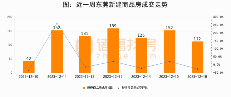 根据东莞市住房和城乡建设局数据显示,2023年12月16日东莞新建商品房成交112套,较昨日减少40套,环比下降26.3%