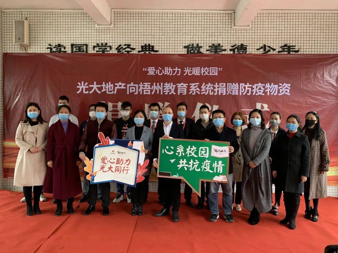光大地产梧州项目向广西梧州两所小学捐赠防疫物资。