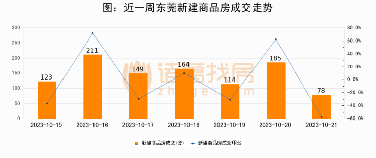 根据东莞市住房和城乡建设局数据显示,2023年10月21日东莞新建商品房成交78套,较昨日减少107套,环比下降57.8%