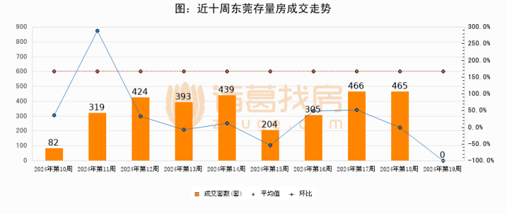 存量房方面,第18周东莞存量房成交0套,较上周减少465套,环比下降100%。从近十周成交走势来看,周均成交套数为309套,本周低于平均水平100%。