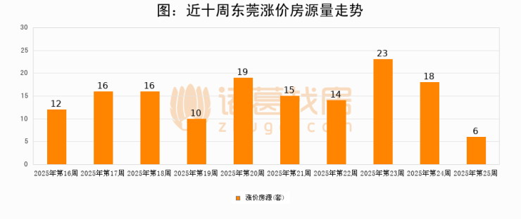 从调价房源来看,第25周东莞涨价房源6套,较上周下降66.7%。与此同时,25周涨价房源占比回落8.94个百分点,业主信心小幅波动,购房者可则需入市。