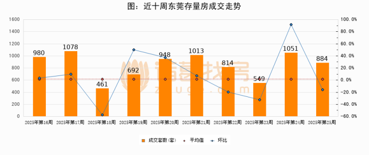 存量房方面,第25周东莞存量房成交884套,较上周减少167套,环比下降15.9%。从近十周成交走势来看,周均成交套数为847套,本周高于平均水平4.4%。