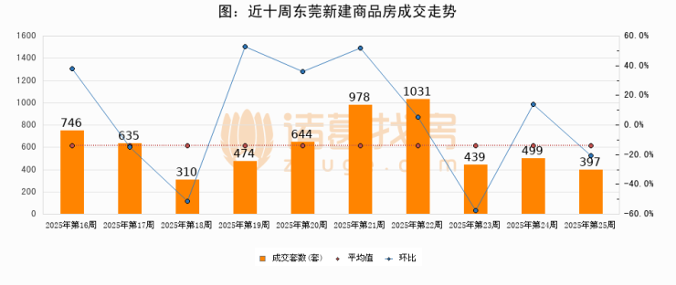 进入2025年第25周(06月16日-06月22日),东莞新建商品房成交397套,较上周减少102套,环比下降20.4%