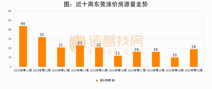 从调价房源来看,第20周东莞涨价房源19套,较上周上涨90%。与此同时,20周涨价房源占比提升9.25个百分点,业主信心持续恢复。