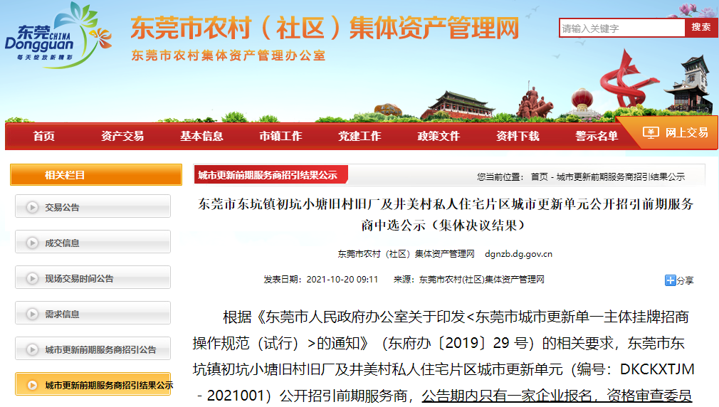 近日,东莞市农村(社区)集体资产管理网发布“东莞市东坑镇初坑小塘旧村旧厂及井美村私人住宅片区城市更新单元公开招引前期服务商中选公示(集体决议结果)”。据该“公告”,确认东莞市华邦集团有限公司为东莞市东坑镇初坑小塘旧村旧厂及井美村私人住宅片区城市更新单元的前期服务商。