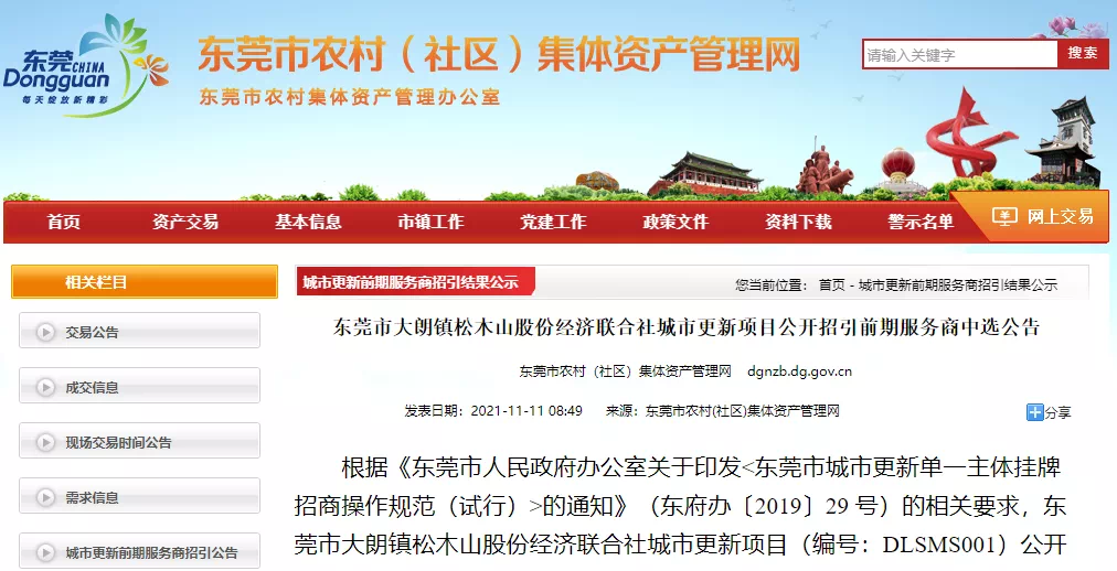 近日,东莞市农村(社区)集体资产管理网发布“东莞市大朗镇松木山股份经济联合社城市更新项目公开招引前期服务商中选公告”。据该“公告”,确认“东莞市大朗乐杰城市更新有限公司”为东莞市大朗镇松木山股份经济联合社城市更新项目(编号:DLSMS001)的前期服务商。公示期为2021年11月11日至2021年11月15日。